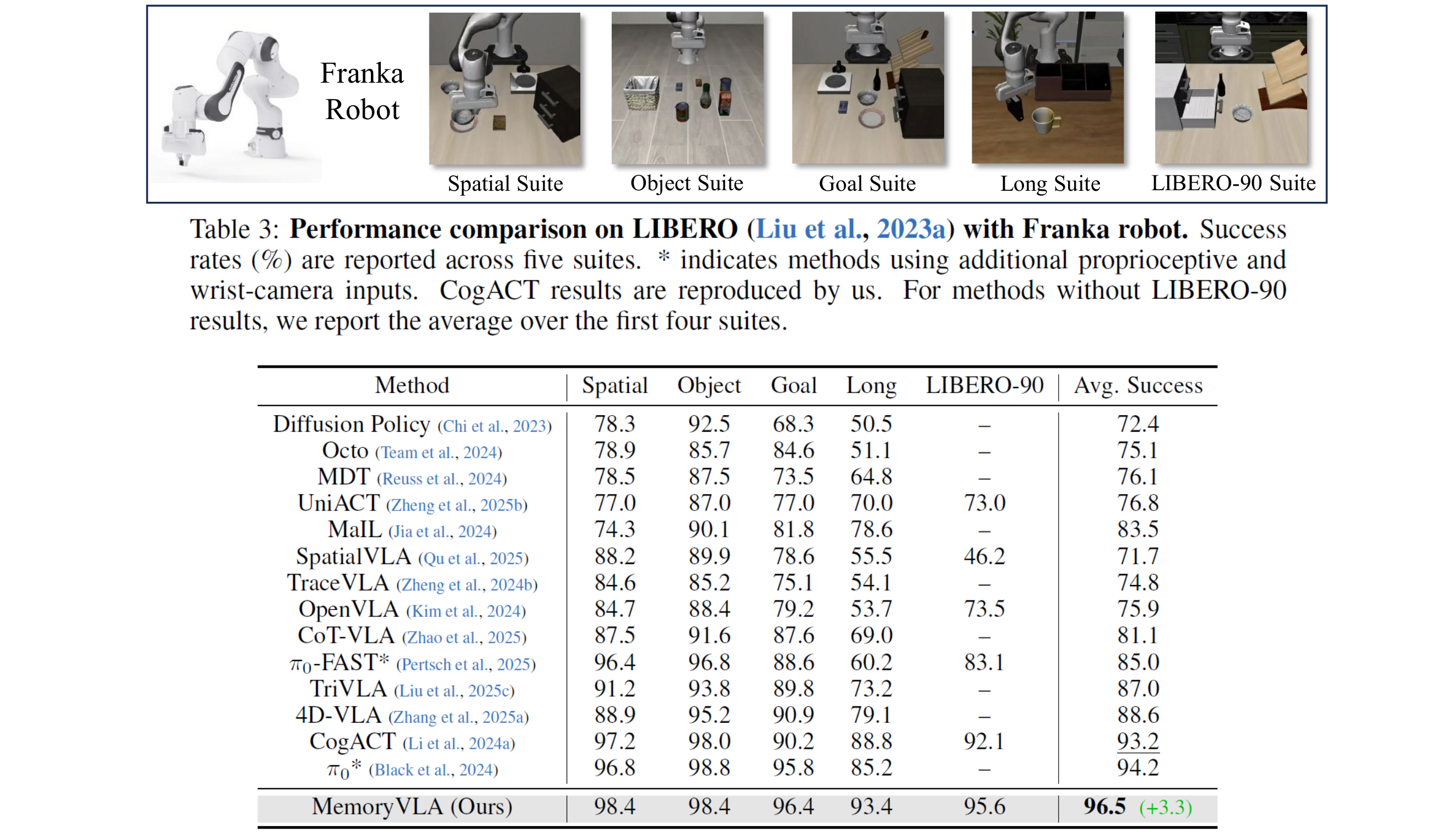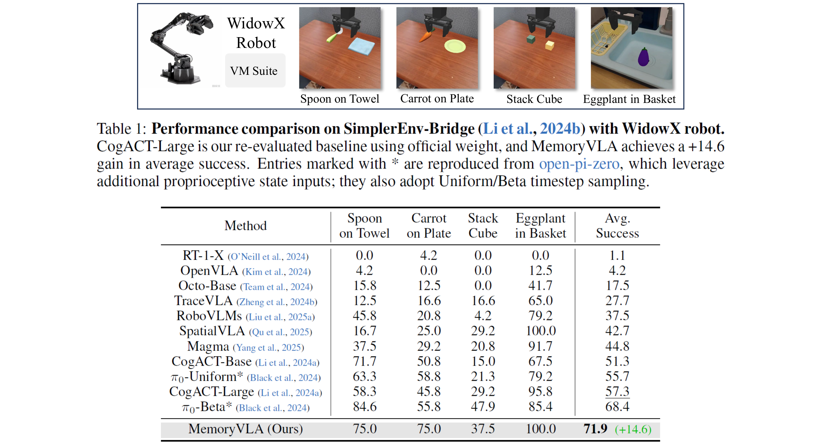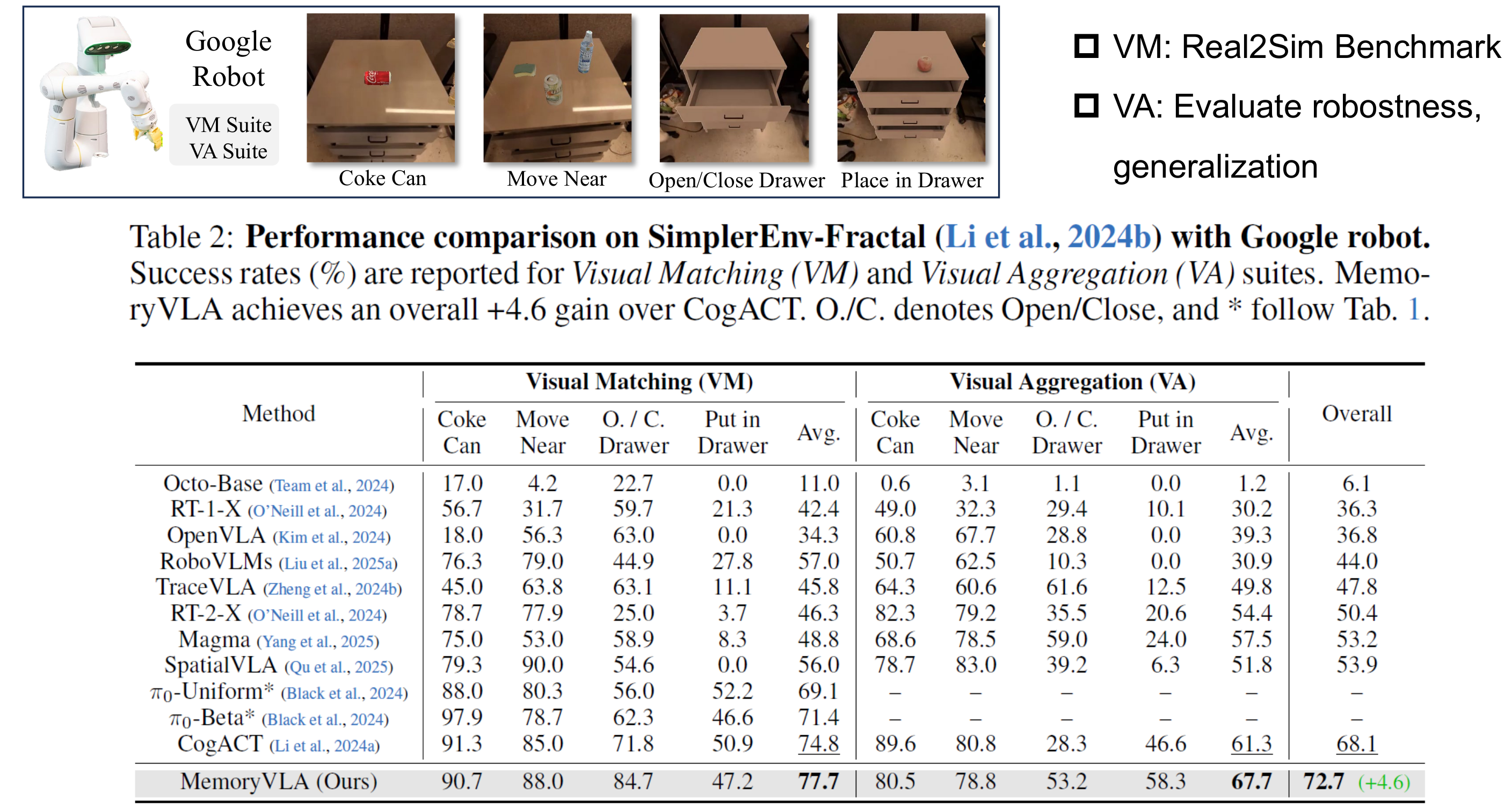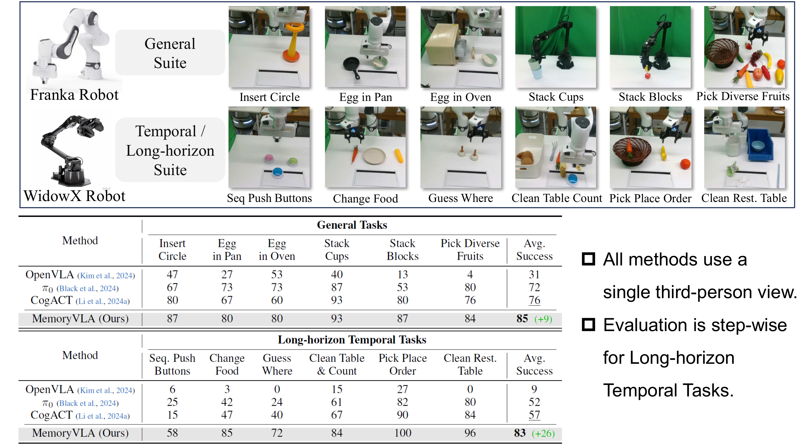 We evaluate MemoryVLA on 150+ simulation and real-world tasks across three robots. On SimplerEnv-Bridge, Fractal, and LIBERO-5 suites, it achieves 71.9%, 72.7%, and 96.5% success rates, respectively, all outperforming state-of-the-art baselines CogACT and PI-0, with a notable +14.6 gain on Bridge. On 12 real-world tasks spanning general skills and long-horizon temporal dependencies, MemoryVLA achieves 84.0% success rate, with long-horizon tasks showing a +26 improvement over state-of-the-art baseline. Moreover, MemoryVLA exhibits strong robustness and generalization under various out-of-distribution conditions.